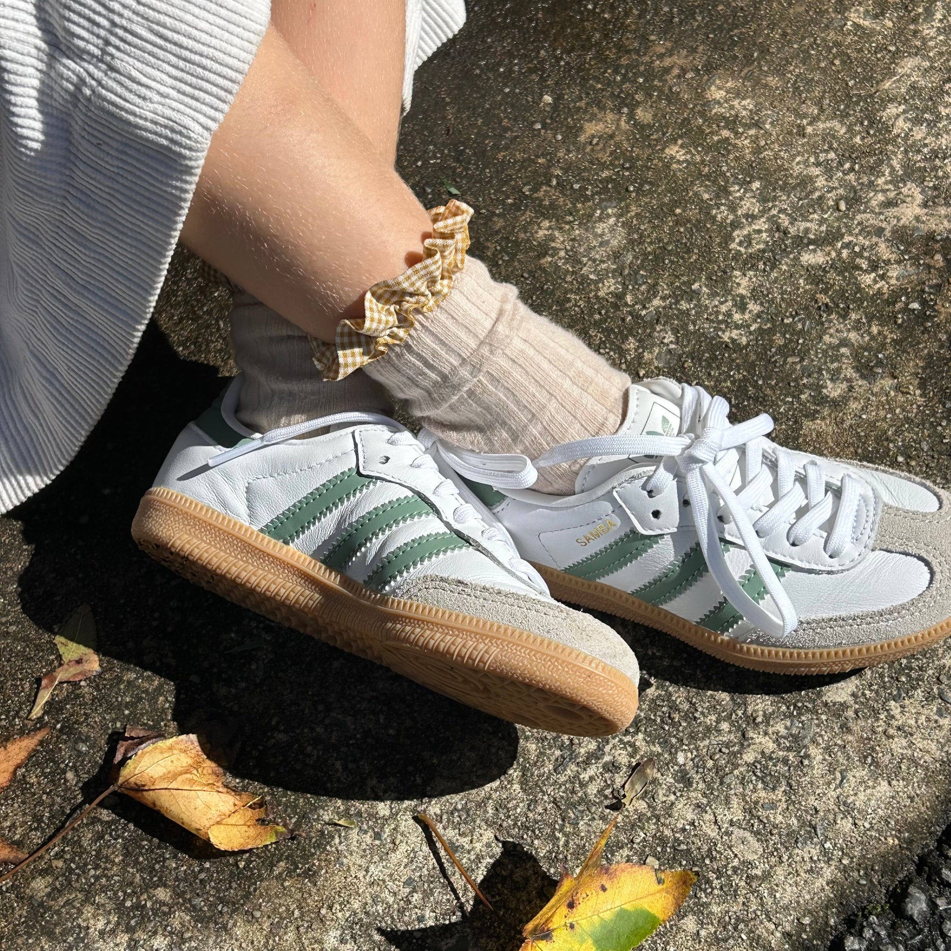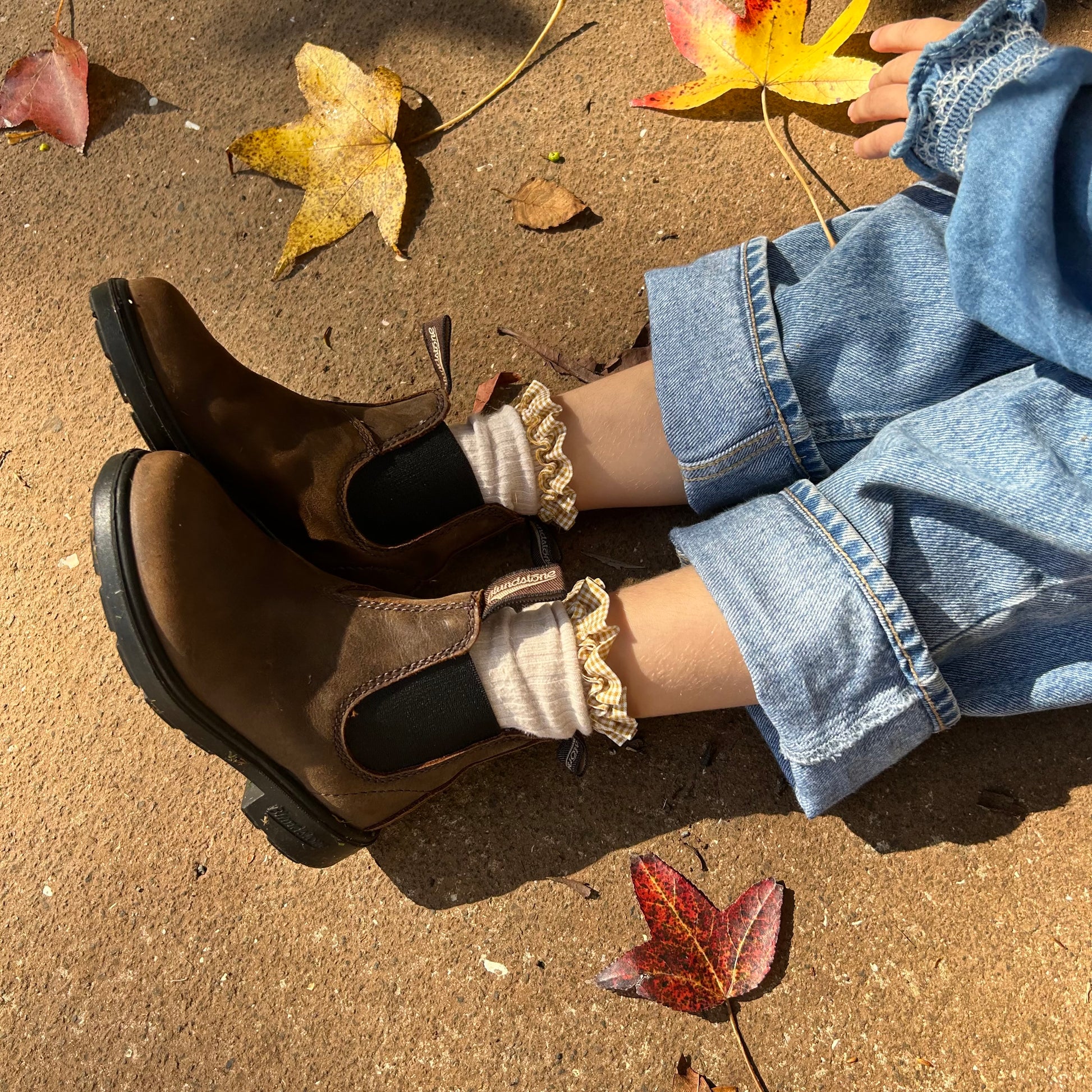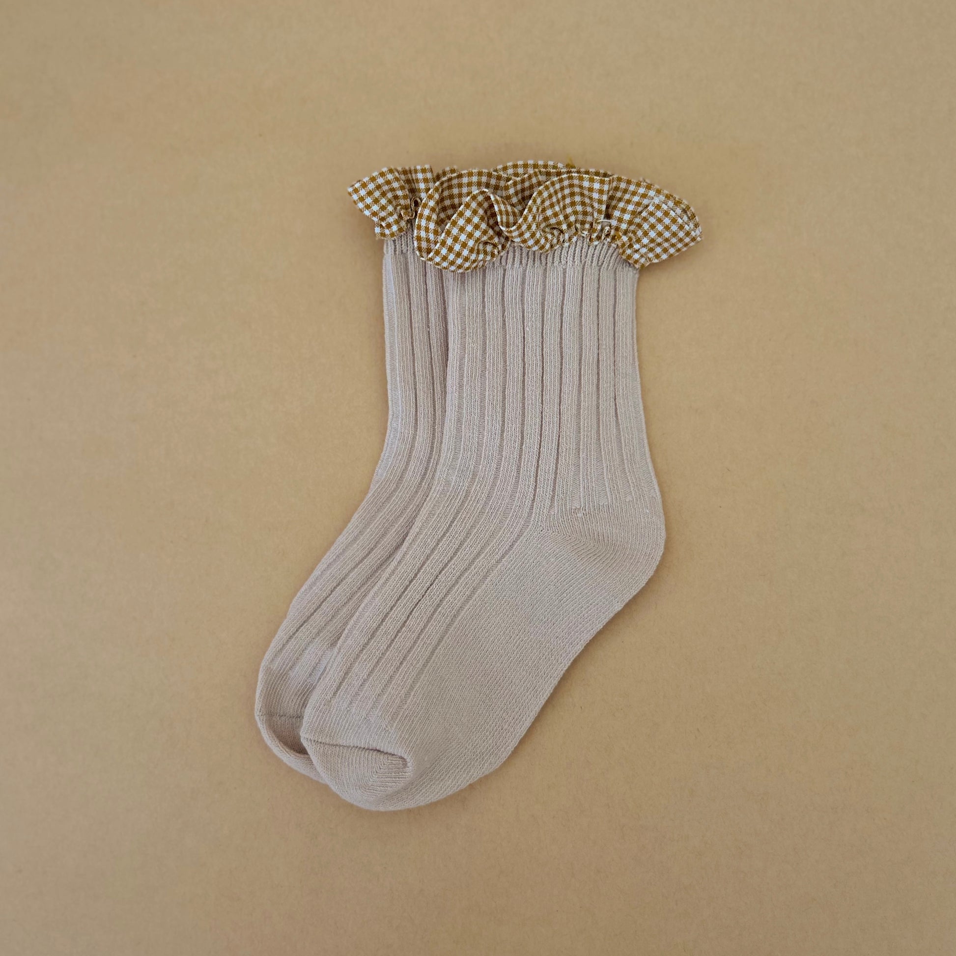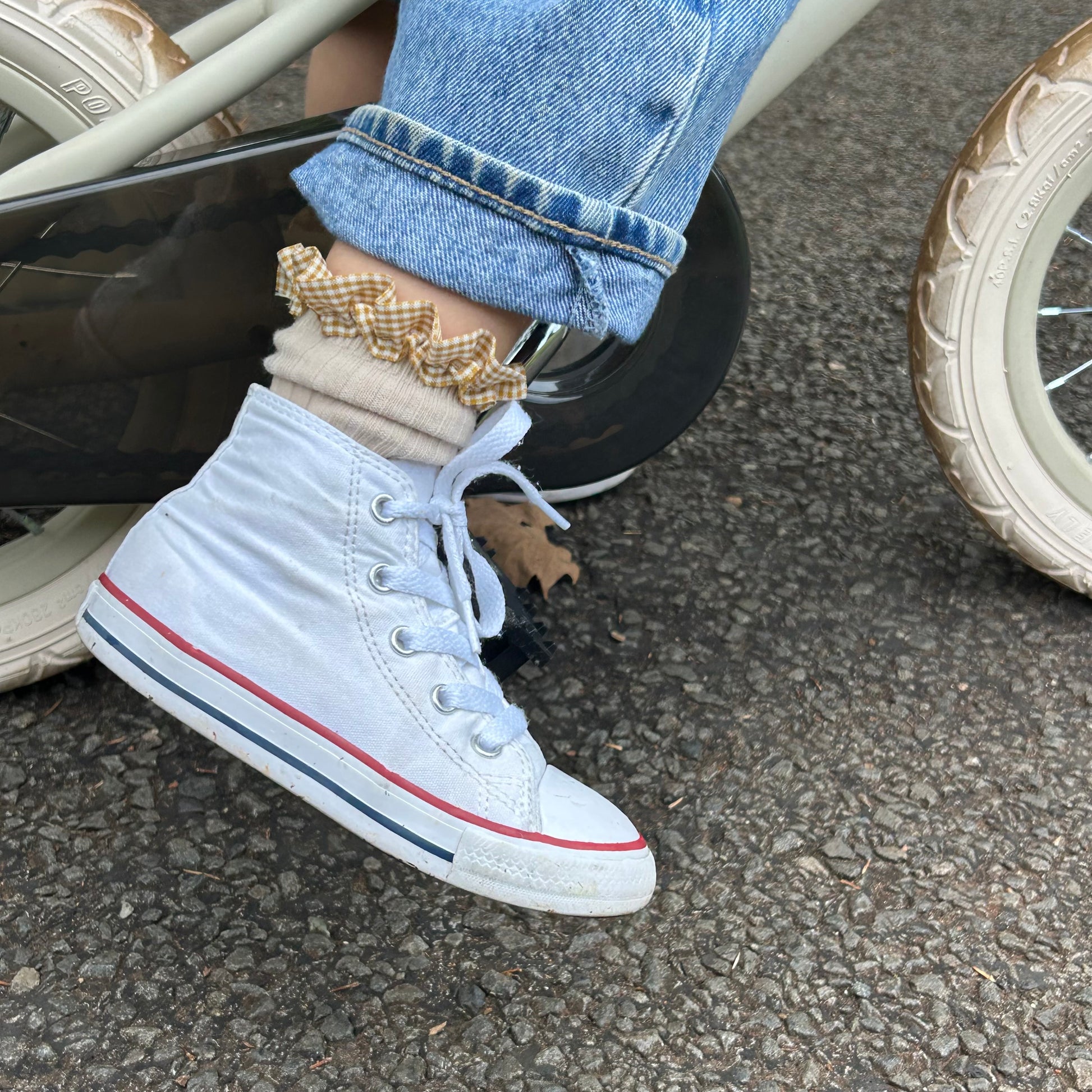 Our Honey socks have a Toffee gingham frill - made for everyday play.